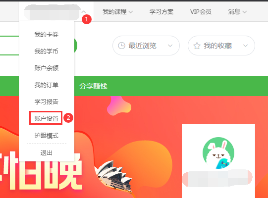 第一步:进入官网:class.hujiang.com,点击用户名右侧三角符号,下拉悬浮框点击“帐号设置”;