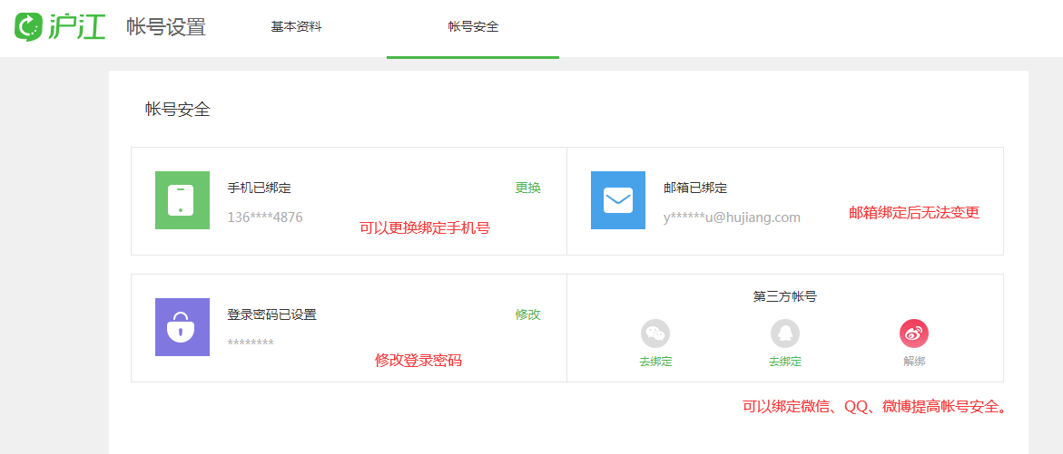 第二步:进入帐号设置页面:https://my.hujiang.com/account 可以针对帐号的基本资料和帐号绑定信息进行设置和修改。