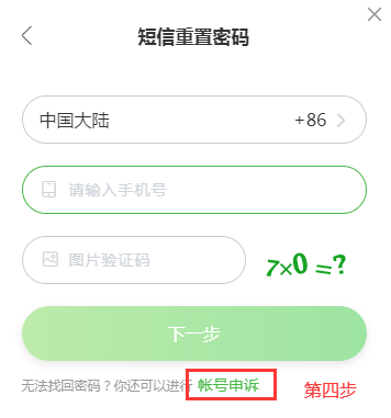 第一步:在登录页面>>帐号密码登录>>忘记密码>>选择短信或邮箱方式>>帐号申诉;