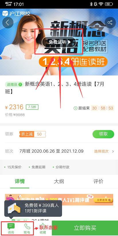 第二步:进入详情页面点击页面上的免费试听即可,如有问题可以左下角客服咨询方式咨询获取帮助。