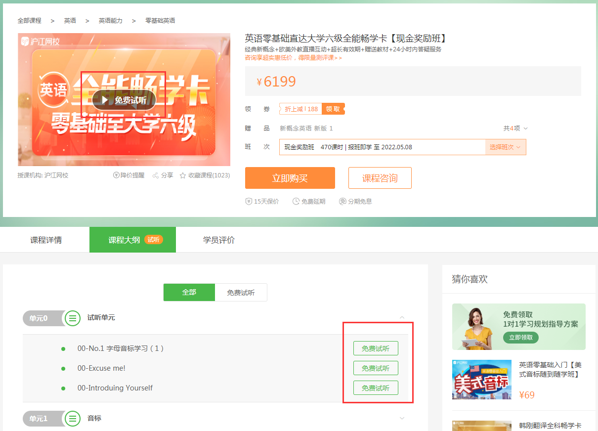第二步:在课程详情页面可以点击试听,方法如下图: