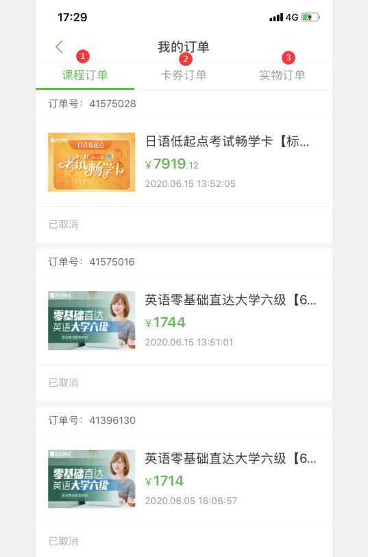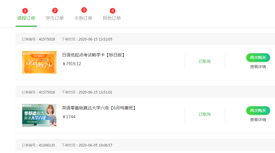 第二步:进入我的订单页面,三个标签页,根据您订单的类型的不一样,展示在不同的标签下面。