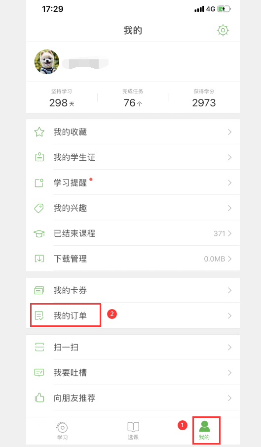 第一步进入沪江网校APP端,进入后,点击我的-》我的订单,进入订单页面。