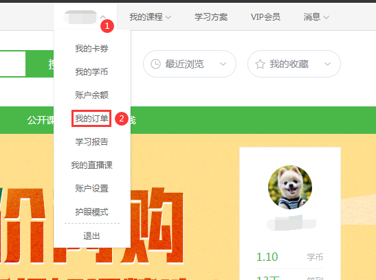 第一步:进入官网:class.hujiang.com ,用户名右击三角图标下拉悬浮框,点击“我的订单”查看订单。