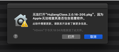 2、下载完成后,双击打开安装文件(***.pkg)。由于苹果系统默认的安全设置,你可能会提示如下警告信息,先点击“好”。