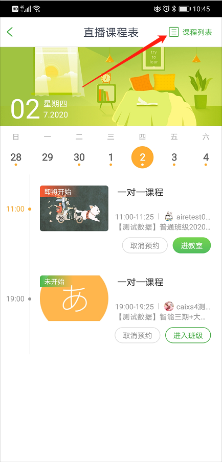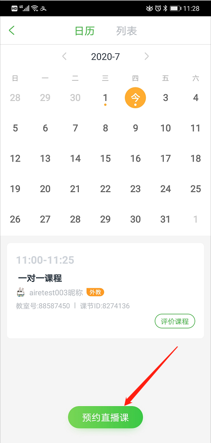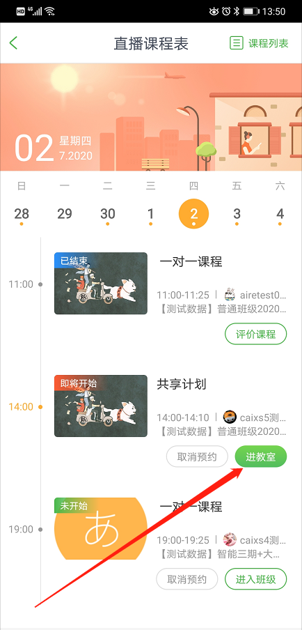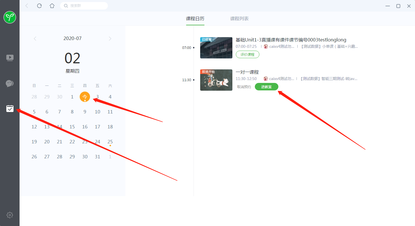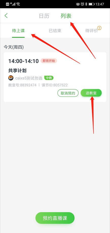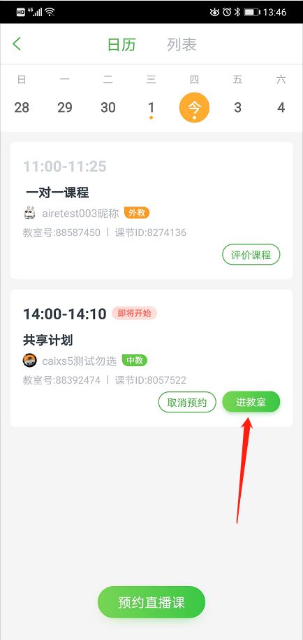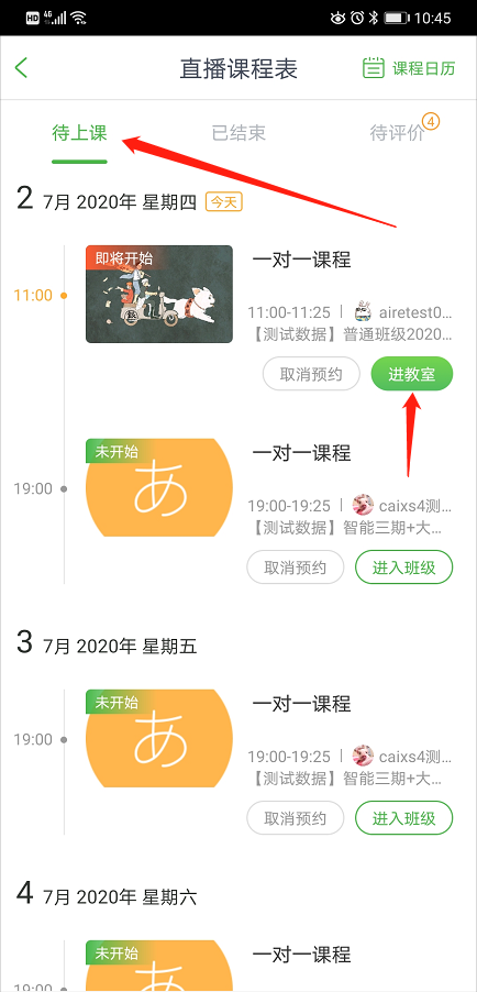 2.2 网校客户端课程表tab可通过课程日历、课程列表待上课页面直接点击进教室(直播课开始前15min~直播课结束)