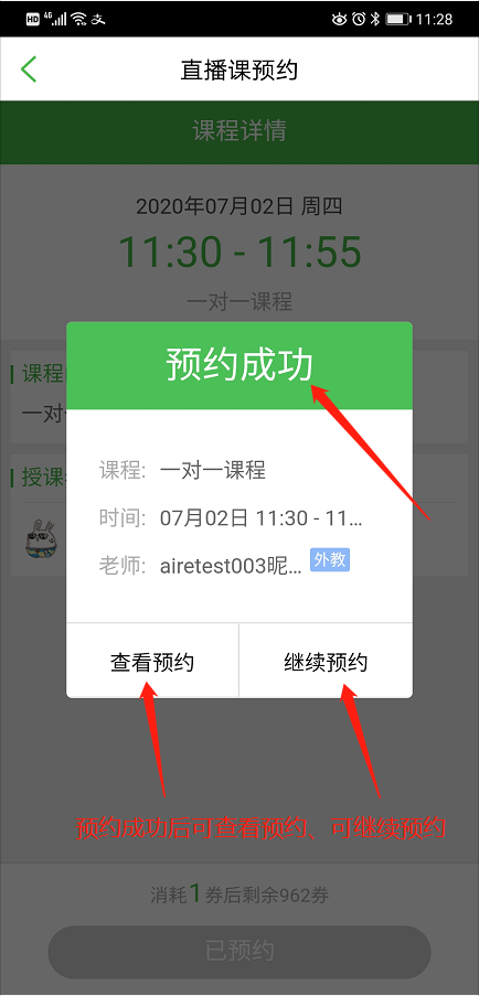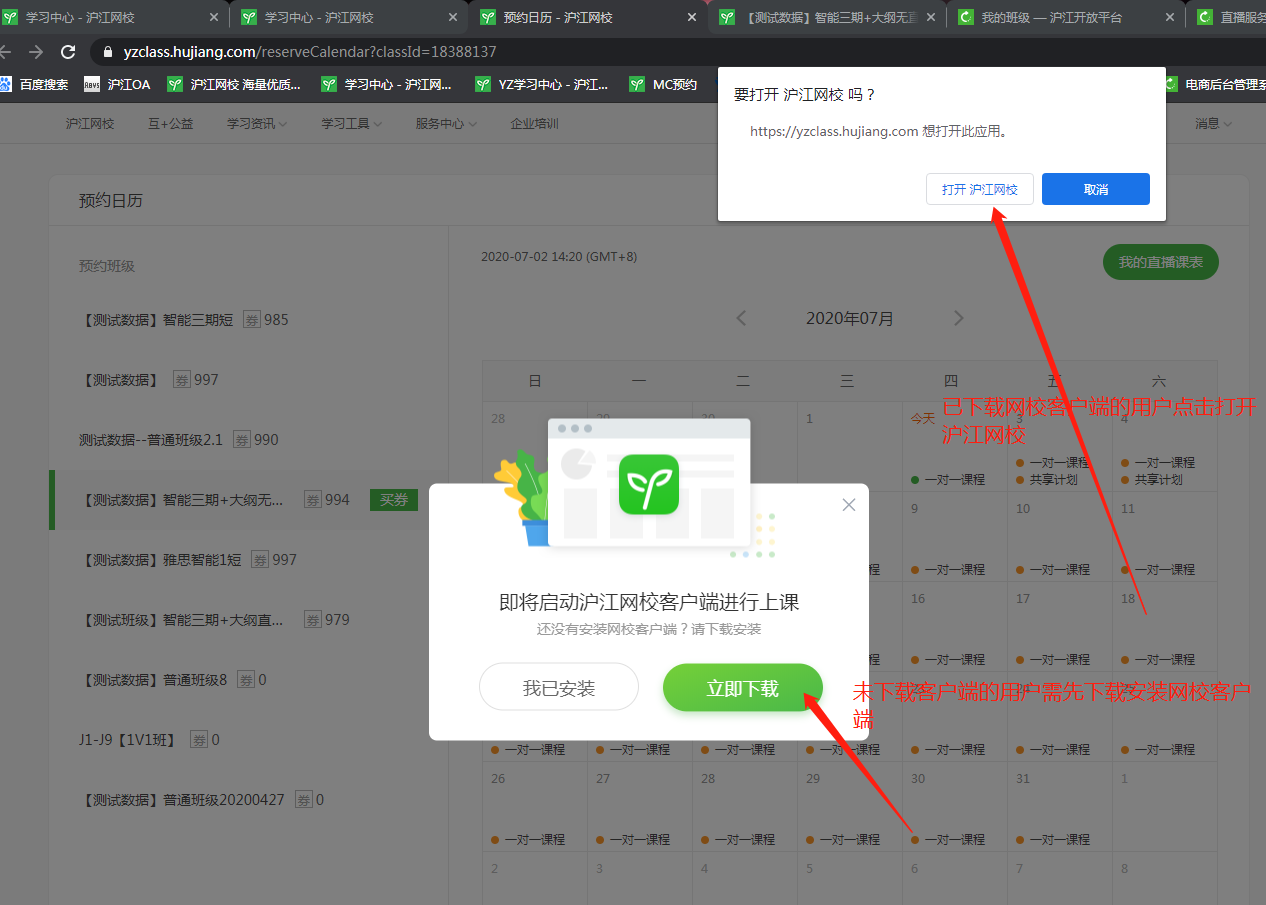 1.4 智能班级首页,大纲内有直播课的班级,需老师排课后,点击预约,预约成功后点击“开始上课”或“正在上课”(直播课开始前15min~直播课结束)可唤起网校客户端