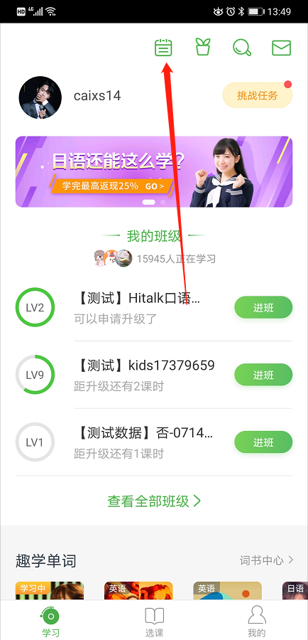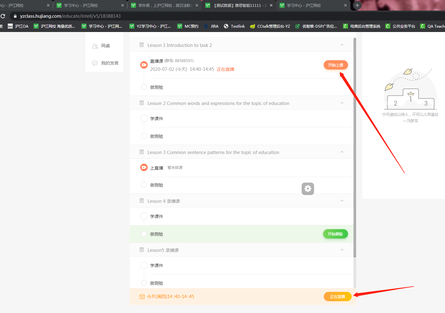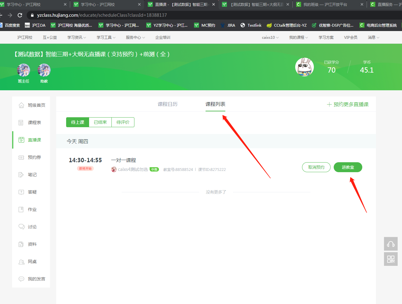全局课程日历+全局课程列表待上课页面点击“进教室”或“立即上课”(直播课开始前15min~直播课结束)